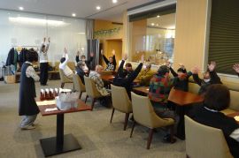 ホテルのランチ楽しみながら、会員同士の交流やゲームを楽しんだ。4人ずつチームを作りスキヤキゲームと題してじゃんけんをしながら材料を揃えるゲーム。じゃんけんやくじを引くドキドキ感、同じ材料が揃ってしまい残念がるチームなど参加者の笑顔で盛り上がりました。 |