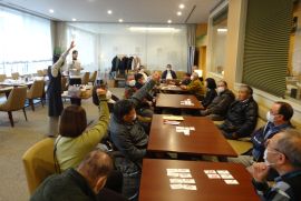 ホテルのランチ楽しみながら、会員同士の交流やゲームを楽しんだ。4人ずつチームを作りスキヤキゲームと題してじゃんけんをしながら材料を揃えるゲーム。じゃんけんやくじを引くドキドキ感、同じ材料が揃ってしまい残念がるチームなど参加者の笑顔で盛り上がりました。 |