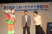 社会生活において広く普及しているカラオケを通して、障害者の社会参加促 進、相互の親睦と交流促進、障害者と健常者相互の友愛の輪を広げるために実 施しました。 出場者も衣装に工夫を凝らして熱演され、かつ歌唱力も素晴らしいものでした。 またアトラクションとして、ケ穎博さんと軽部美智子さんの歌謡ショーがあり、大変 好評を得ました。