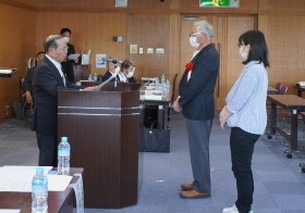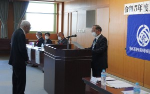会長挨拶の後、退任した市町村団体会長に、米川会長から表彰状が贈呈されました。