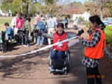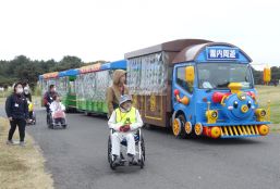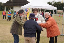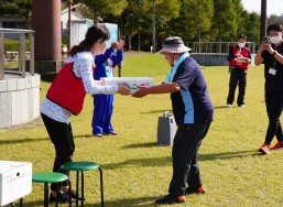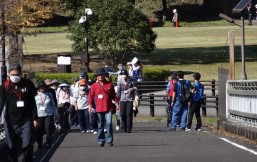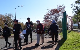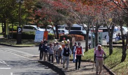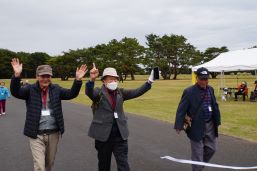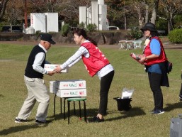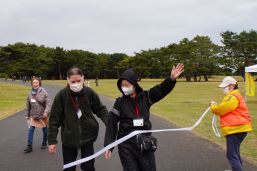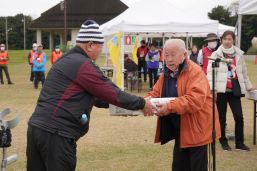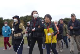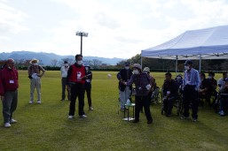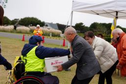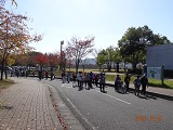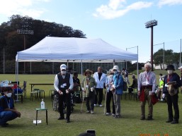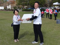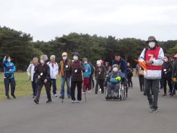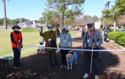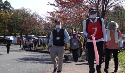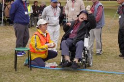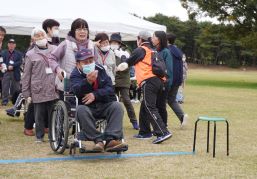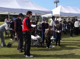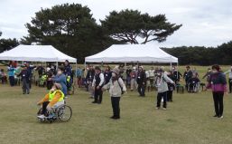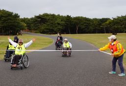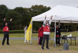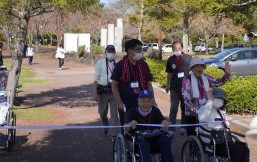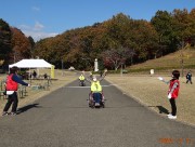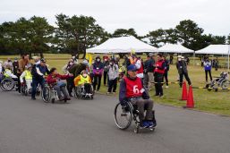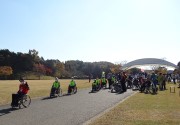 晴天に恵まれ朝から素晴らしい秋空が広がり、機能回復訓練を行いました。走行、歩行訓練コースは大子広域公園多目的運動広場を出発し、オートキャンプ場を回って来るコース(約2km)途中森林の架け橋の坂道などもありましたが、協力者の手を借りて、参加者全員が無事ゴールすることが出来ました。